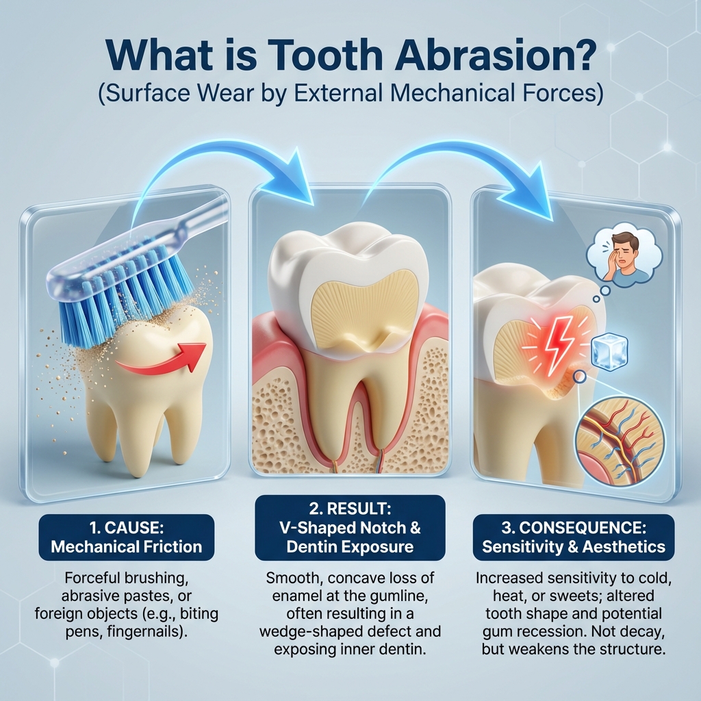 Abrasion (Tooth Surface) refers to the wear or loss of tooth structure caused by mechanical actions other than normal chewing. Common causes include overly vigorous toothbrushing, using abrasive toothpaste or toothpicks, and holding or biting hard objects; the wear often appears as a V-shaped or flattened notch near the gumline and can extend into dentine if advanced.