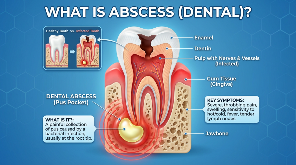An Abscess (Dental) is a pus-filled pocket that forms when bacteria infect the tooth pulp or the periodontal tissues surrounding a tooth. There are two common types — a periapical abscess at the tip of a root and a periodontal abscess in the gums — and both can cause intense, throbbing pain, visible swelling, a bad taste or odor in the mouth, sensitivity to hot or cold, and sometimes fever or swollen lymph nodes if the infection extends beyond the local area.
