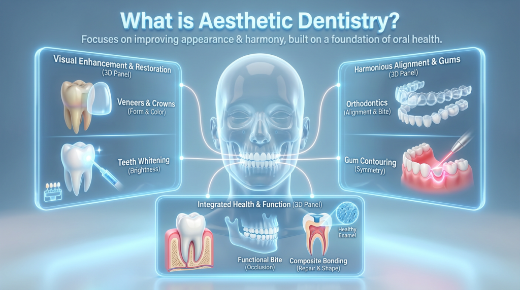Aesthetic Dentistry is the branch of dental care dedicated to improving the appearance of the teeth, gums and overall smile. It combines clinical techniques and artistic considerations to address concerns about tooth colour, shape, size, alignment and gum contour, aiming for natural-looking, harmonious results.