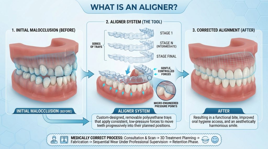 An aligner is a thin, custom-made, transparent thermoplastic tray that fits snugly over the teeth to apply gentle, controlled pressure and move them into a new position over time. Unlike traditional fixed braces, aligners are removable for eating and cleaning and are typically worn for 20-22 hours a day while being replaced every one to two weeks as the treatment progresses.