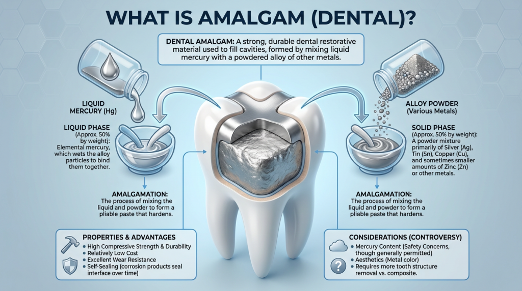 Dental amalgam is a restorative material composed of liquid elemental mercury combined with a powdered metal alloy, typically containing silver, tin and copper. It has been used for many decades to fill cavities because it sets into a hard, wear-resistant substance that can withstand biting forces; placement involves removing decayed tooth tissue, shaping the cavity and packing the amalgam into place where it condenses and hardens to restore function.