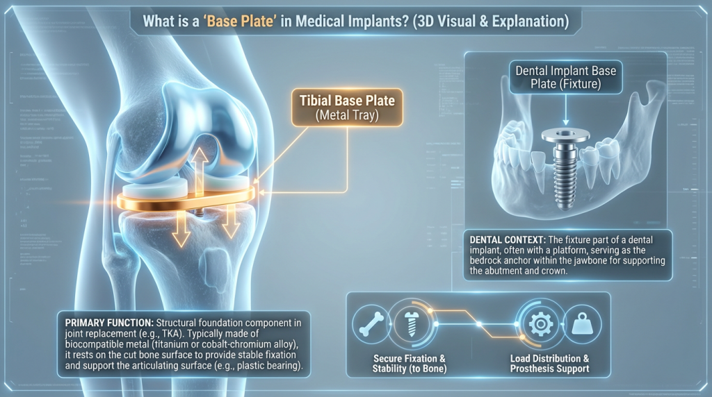 A base plate is a provisional, rigid plate—often made from acrylic resin or similar materials—that fits over the edentulous (toothless) area of the mouth to provide a stable reference surface. It acts as a record base to support wax rims and temporary tooth arrangements, helping clinicians assess how the denture will sit relative to the gums and surrounding tissues.