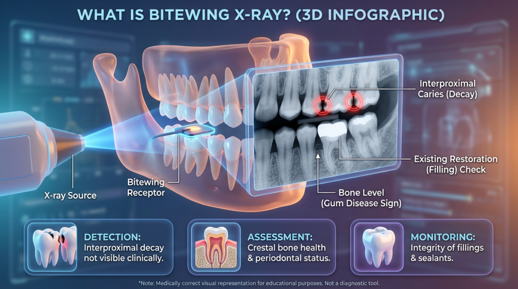 The procedure is quick and simple: the patient bites on a tab or holder that positions the sensor or film while the X-ray is taken. Radiation exposure is low, and dentists use bitewing images routinely to spot problems early so that conservative treatments such as fillings or periodontal care can be planned if necessary.