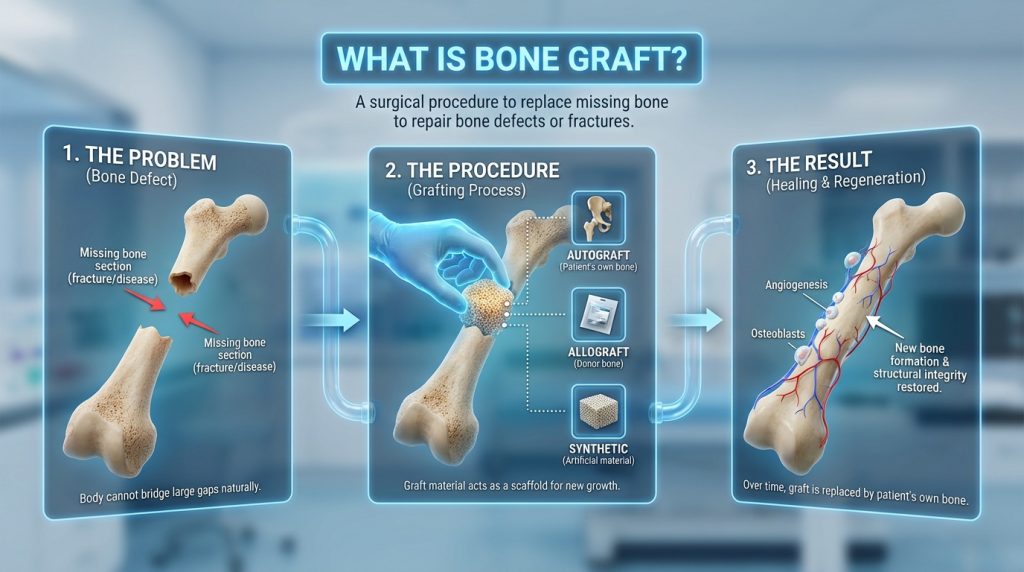 A bone graft is a surgical procedure used to rebuild or augment missing or deficient bone in the jaw. It provides additional bone volume and structural support when natural bone has been lost due to tooth extraction, periodontal disease, trauma, infection, or long-term resorption, and it is commonly used to create a stable foundation for dental implants or to restore facial contours.
