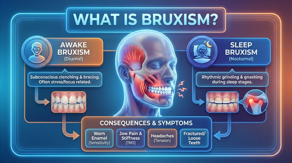 Bruxism is the involuntary grinding or clenching of the teeth, which may happen during sleep (sleep bruxism) or while awake (awake bruxism). It is commonly associated with stress, anxiety, abnormal bite alignment (malocclusion) or sleep disorders, and typical signs include worn or chipped teeth, increased tooth sensitivity, jaw muscle soreness and frequent headaches.