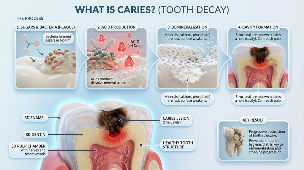 Caries is the medical term for tooth decay, a process in which acids produced by bacteria in dental plaque gradually demineralise and destroy the hard tissues of the tooth (enamel and dentine). It often begins as small, hard-to-see areas of enamel demineralisation and can progress to cavities, sensitivity, pain, and infection if left untreated.