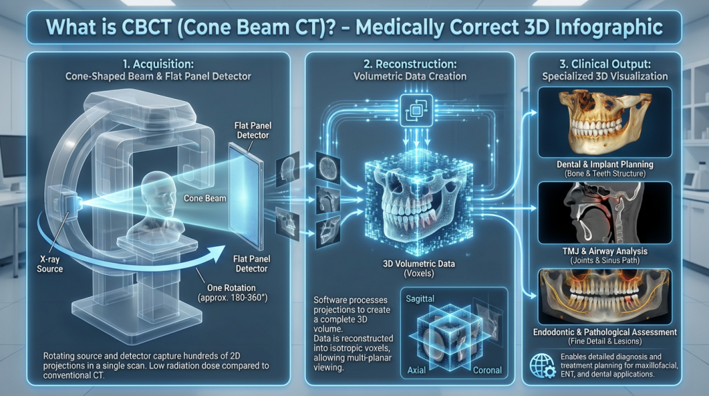 CBCT (Cone Beam CT) is a specialised type of x-ray imaging that produces three-dimensional images of the teeth, jaws, airway, sinuses and surrounding bone. Unlike traditional two-dimensional dental x-rays, CBCT captures a volumetric dataset that clinicians can view from multiple angles to assess anatomy and pathology in greater detail.