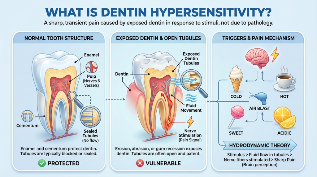 Dentin hypersensitivity occurs when dentin—the layer beneath the tooth enamel and cementum—becomes exposed and allows stimulation of the tiny channels (dentinal tubules) that lead to the nerve. People with this condition usually report brief, sharp pain triggered by cold drinks, hot foods, sweet or acidic foods, air, or brushing; common causes include enamel erosion, gum recession exposing the root surface, aggressive brushing, tooth grinding, and some dental procedures.