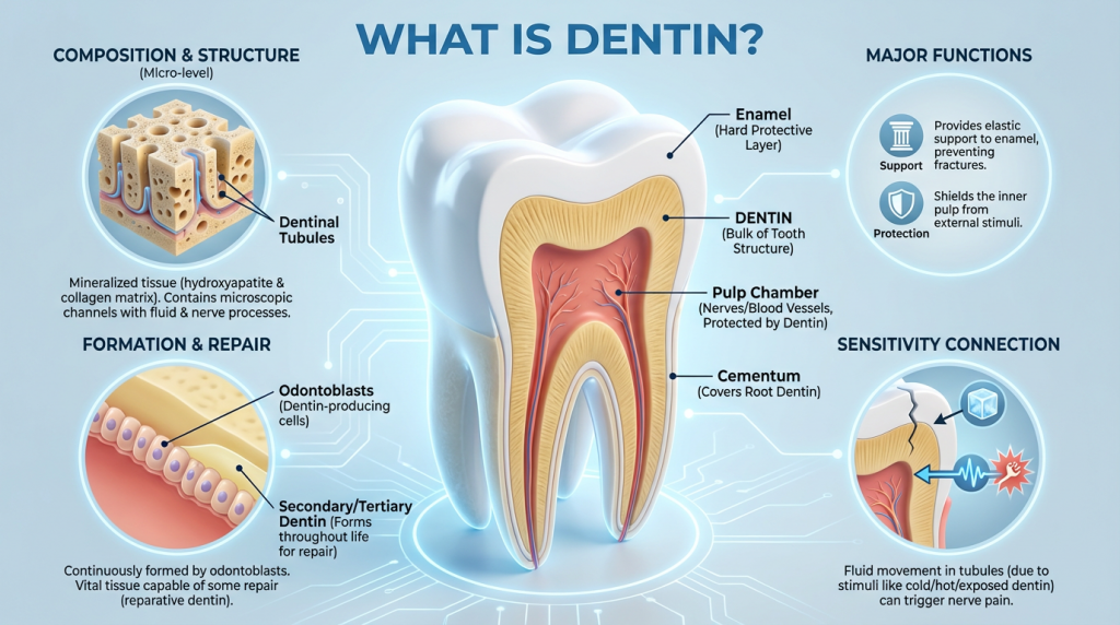 Dentin is the layer of hard tissue that makes up the bulk of a tooth beneath the outer enamel and around the central pulp chamber. It is less mineralised than enamel, contains microscopic tubules that transmit sensations to the nerve, and provides structural support to both the crown and the root.