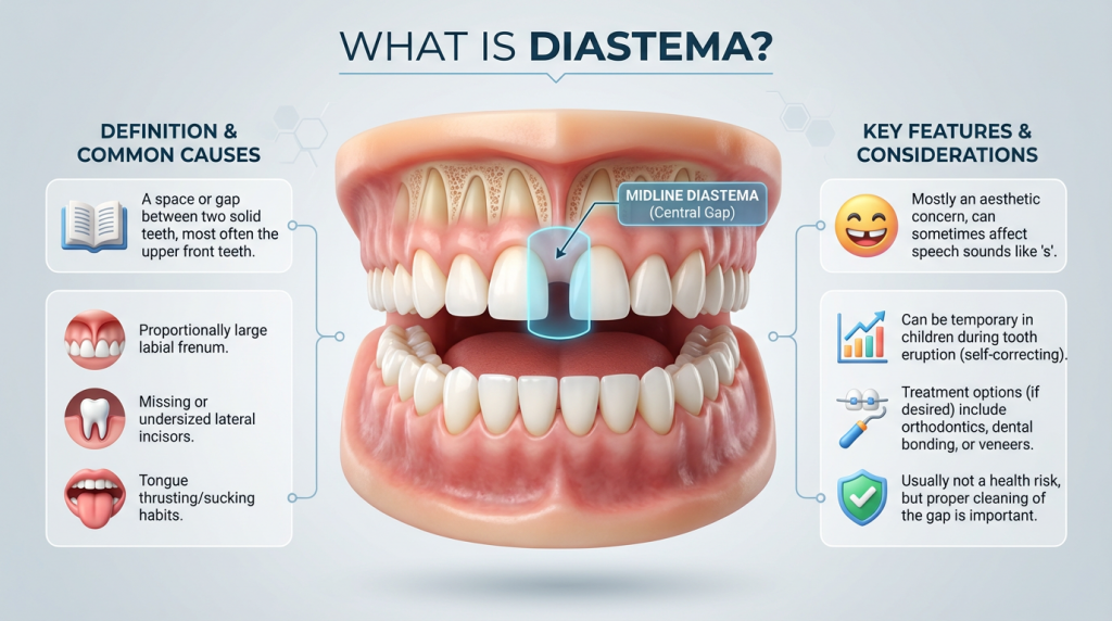 Diastema is the dental term for a space or gap between two teeth, most commonly seen between the upper central incisors. The gap may occur from differences in tooth size and jaw width, missing or undersized teeth, an enlarged or high labial frenum, childhood habits such as thumb-sucking, or periodontal (gum) disease, and it can affect appearance, speech, or oral health depending on the cause and size of the space.