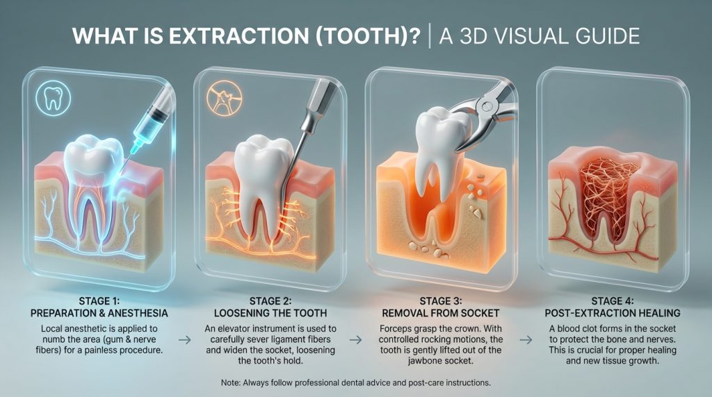 The procedure is usually performed under local anaesthesia and sometimes with sedation for anxious patients, involving careful loosening and removal to minimise damage to surrounding bone and tissues. Aftercare focuses on pain control, oral hygiene, avoiding actions that disturb the clot (such as smoking or vigorous rinsing), and following post-operative advice to reduce risks like prolonged bleeding or dry socket and to support healing.