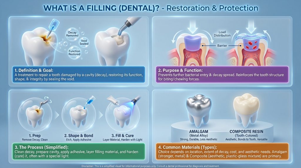 A dental filling is a common restorative procedure used to repair a tooth that has been weakened by decay, cracked, or otherwise damaged. The dentist removes the decayed or damaged tissue, cleans the area, and places a filling material to restore the tooth’s shape and function; common materials include tooth-coloured composite resin, silver amalgam, glass ionomer, ceramic or metal alloys. The choice of material depends on the size and location of the defect, aesthetic concerns, durability needs and any allergies or sensitivities a patient may have.