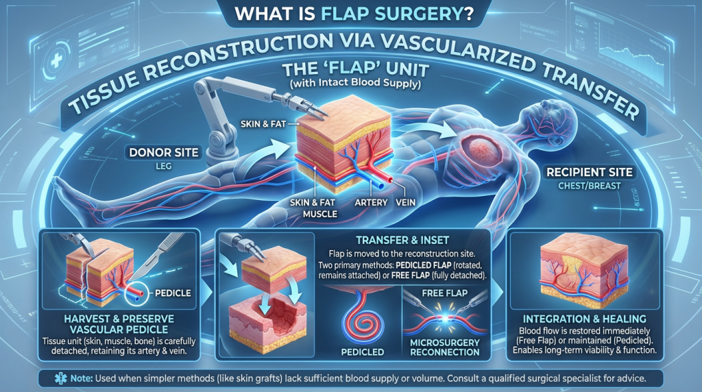 Flap surgery is a periodontal operation used to treat moderate to advanced gum disease by lifting the gum tissue away from the teeth to expose root surfaces and the supporting bone. This approach lets the clinician remove plaque and calculus from deep periodontal pockets, inspect and smooth diseased root surfaces, and, when necessary, reshape bone or place grafting material to encourage reattachment and reduce pocket depth.