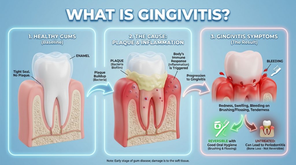 Gingivitis is inflammation of the gingiva (gums) most commonly caused by the accumulation of dental plaque, a sticky bacterial biofilm that forms on teeth. Typical signs include red, swollen or tender gums that bleed easily during brushing or flossing, along with bad breath; diagnosis is usually made by a dental examination which may include probing for bleeding and assessing oral hygiene and risk factors such as smoking, diabetes, certain medications, or hormonal changes.