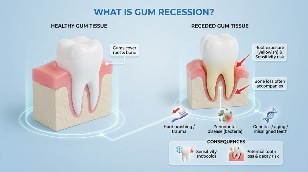 Gum recession is the gradual retreat of the gum margin away from the tooth, exposing the tooth root and creating the appearance of longer teeth. It can result from factors such as aggressive tooth brushing, periodontal (gum) disease, tobacco use, tooth grinding, misaligned teeth, or the natural ageing process, and commonly causes tooth sensitivity, visible root exposure and increased risk of root decay.