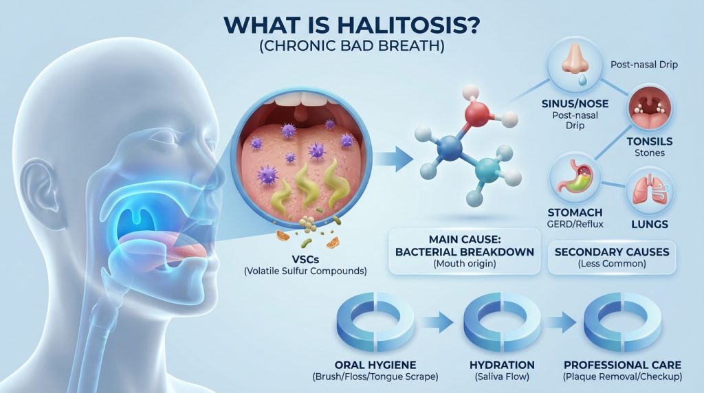Halitosis refers to persistent or recurring unpleasant breath odor. In most cases the source is intraoral: bacteria on the tongue, periodontal (gum) disease, untreated tooth decay, food debris, or reduced saliva flow (dry mouth) that allows odour-producing bacteria to thrive; less commonly it may be linked to infections in the nose, throat, sinuses, or to systemic conditions such as certain metabolic disorders.
