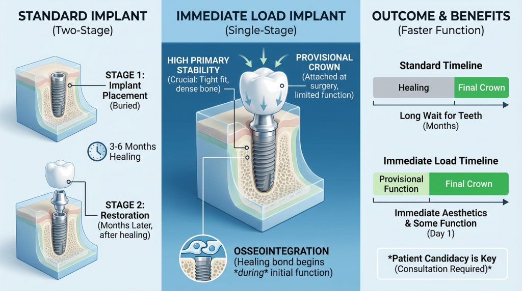 Immediate Load Implant describes a treatment approach in which a dental implant is placed into the jaw and a temporary or definitive prosthetic tooth is attached very soon after surgery, often on the same day or within 48 hours. The procedure aims to restore function and appearance quickly, but it relies on good primary stability of the implant at placement, precise surgical technique and thorough preoperative planning including imaging to ensure the implant can withstand early loading.