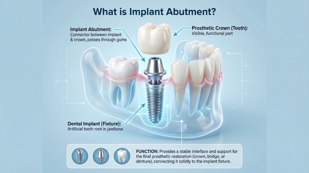 An implant abutment is the component that links a dental implant (the titanium post placed in the jawbone) to the visible restorative piece, such as a crown, bridge or denture. Abutments may be prefabricated or custom-made and are commonly made from titanium, titanium alloy or ceramic; they attach to the implant either by a screw or by cementing and help transfer chewing forces from the restoration to the implant.