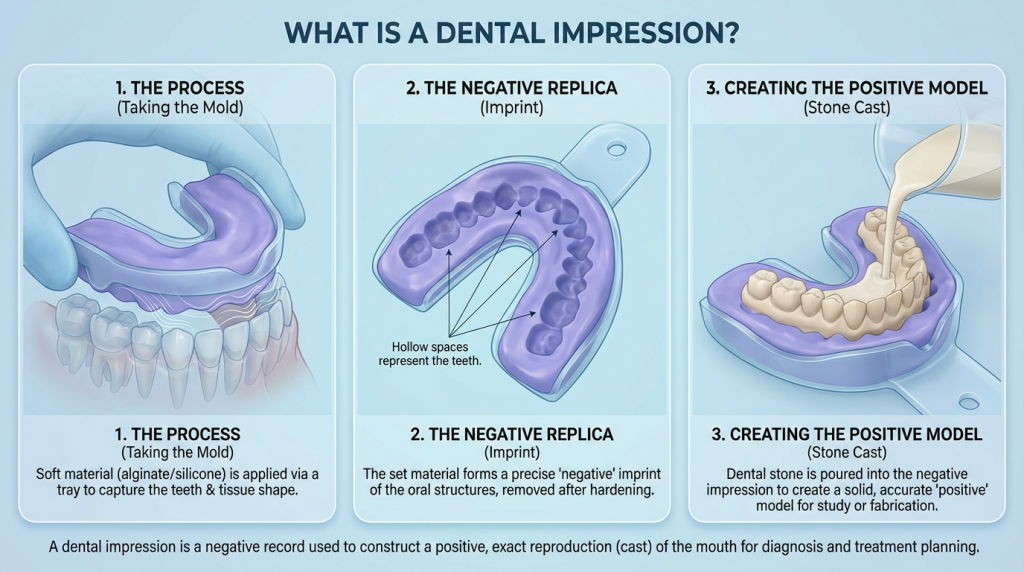 An Impression (Dental) is a negative replica of the teeth and gums made to capture the precise contours and relationships of oral structures. Traditional impressions involve placing a tray filled with a soft, setting material such as alginate or silicone over the teeth until it sets, while digital impressions use an intraoral scanner to capture a 3D image without impression material; both approaches aim to produce an accurate cast or digital model for laboratory work.
