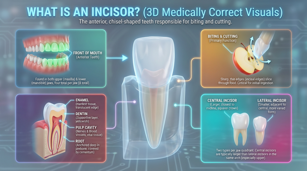 An incisor is one of the front teeth in the upper and lower jaws, typically arranged as central and lateral incisors on each side. These teeth have a thin, sharp biting edge designed to cut food and play an important role in articulation and appearance; each incisor is covered by enamel and usually has a single root anchoring it in the jaw.
