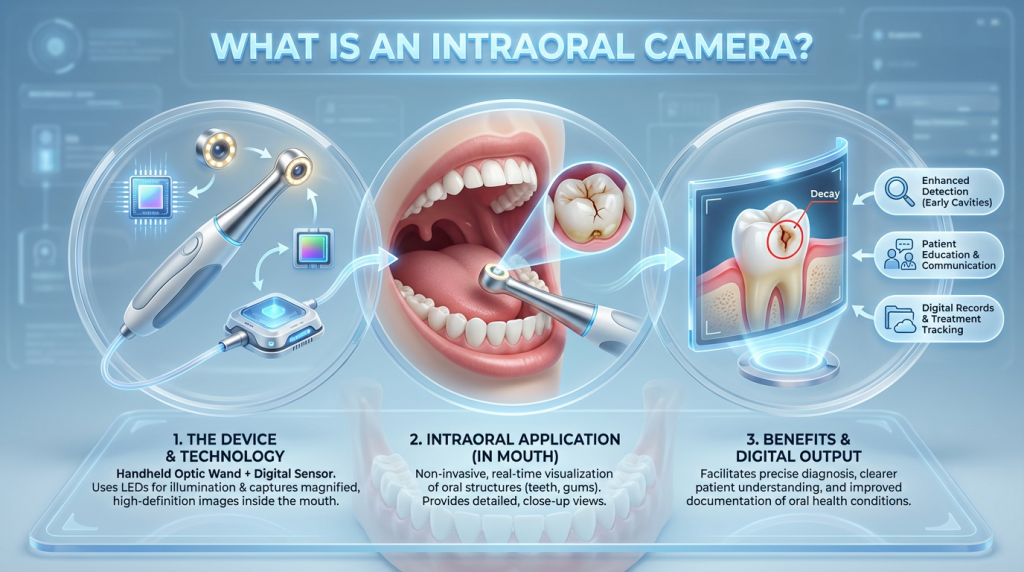An intraoral camera is a compact, hand-held device that captures high-resolution images of the inside of the mouth. The camera is placed inside the mouth to provide magnified, real-time views of tooth surfaces, restorations, cracks, early decay and soft tissues, helping clinicians see details that can be difficult to detect with the naked eye.