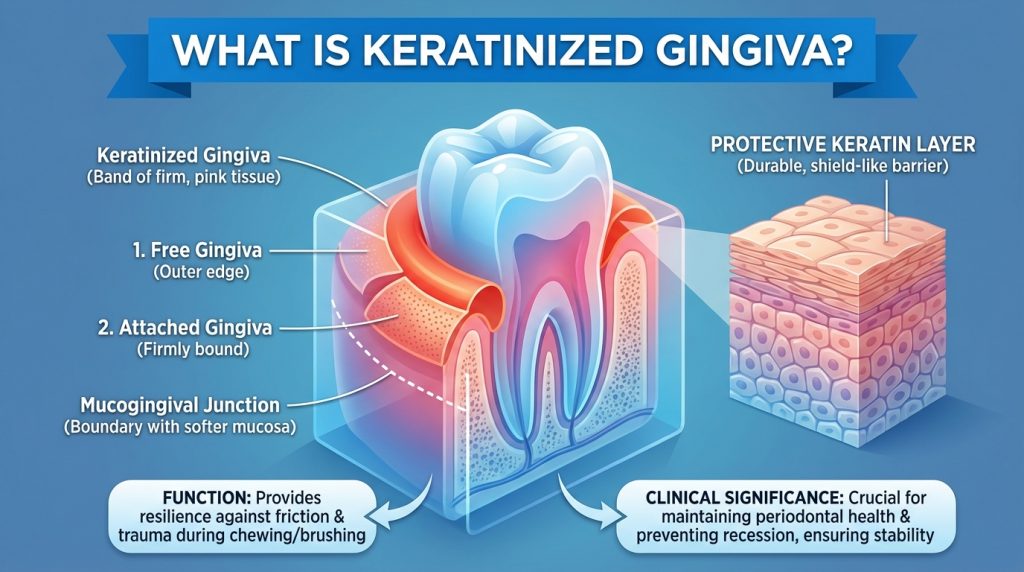 Keratinized gingiva is the band of firm, pink gum tissue that extends from the free gingival margin to the mucogingival junction and includes the attached gingiva. This tissue is covered by a keratinized (toughened) epithelial layer, which makes it more resistant to mechanical forces such as chewing and toothbrushing compared with the non-keratinized alveolar mucosa.