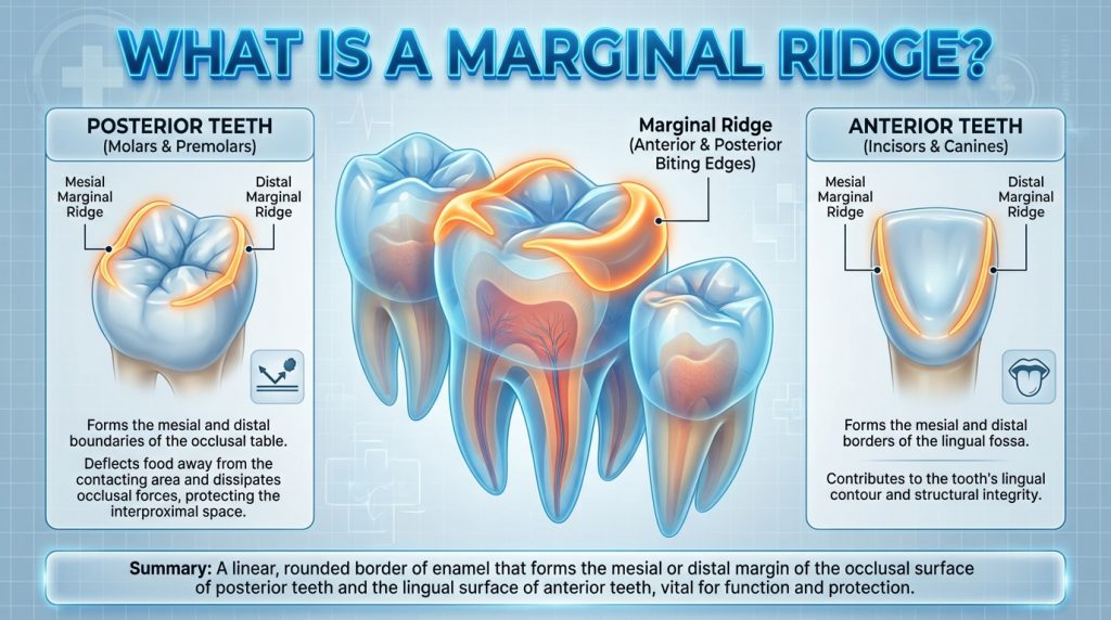 Marginal ridges are the elevated enamel crests that form the mesial and distal borders of a tooth’s occlusal surface on posterior teeth and the lingual borders on anterior teeth. They separate the chewing or biting surface from the adjacent proximal surfaces and contribute to proper tooth shape, contact with neighbouring teeth and effective chewing function.