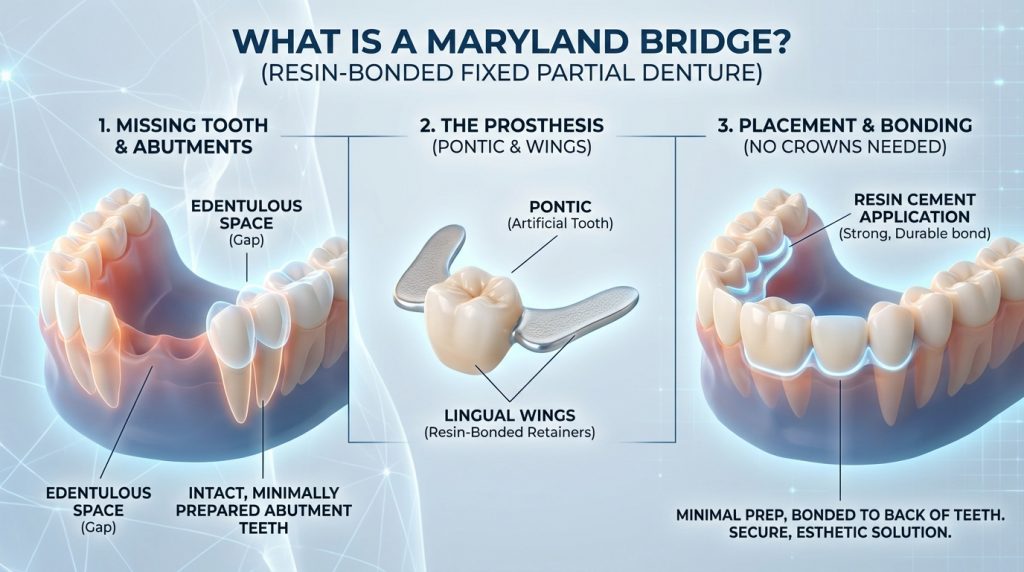 A Maryland Bridge is a type of resin-bonded dental bridge used to replace a single missing tooth by attaching a false tooth (pontic) to the back of adjacent teeth with metal or ceramic wings that are bonded with dental resin. Because the wings are adhesively bonded to the enamel rather than supporting full crowns, this technique usually requires minimal removal of healthy tooth structure.