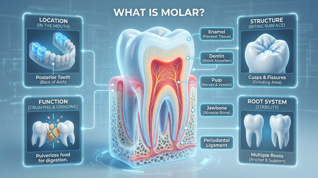 Molars are the large, flat teeth located at the back of the mouth designed primarily for grinding and breaking down food. In adults there are usually three molars on each side of the upper and lower jaws (including the third molars commonly called wisdom teeth), while children have primary molar teeth that are later replaced by permanent premolars.