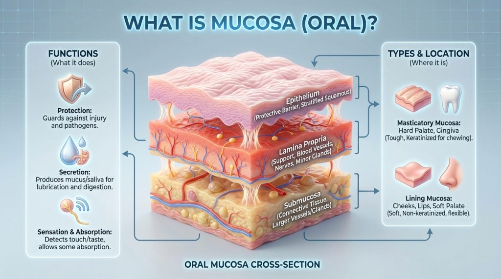 The oral mucosa is the soft, moist lining of the mouth made up of an outer epithelial layer and an underlying connective tissue layer called the lamina propria. Different areas of the mouth have different types of mucosa — for example, keratinized mucosa covers the gums and hard palate to resist chewing forces, while non-keratinized mucosa lines the cheeks, floor of the mouth and inner lips to allow flexibility — and the mucosa plays roles in protection, sensation, lubrication and immune defence.