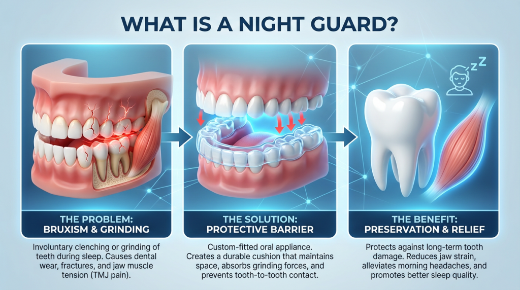 A night guard is a removable dental appliance that fits over the teeth to create a barrier between the upper and lower arches during sleep. It is commonly made from soft or hard acrylic and is used to manage bruxism (tooth grinding) and clenching, helping to reduce tooth wear, prevent fractures, and ease associated jaw muscle pain and headaches.