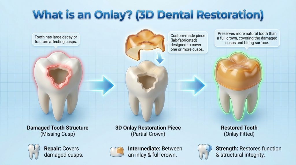 An onlay is a type of indirect dental restoration fabricated outside the mouth to repair a tooth that has damage extending beyond what a simple filling can restore. It covers one or more of the chewing surfaces (cusps) of a tooth and is bonded into place, restoring shape and function while conserving more natural tooth tissue than a full crown.