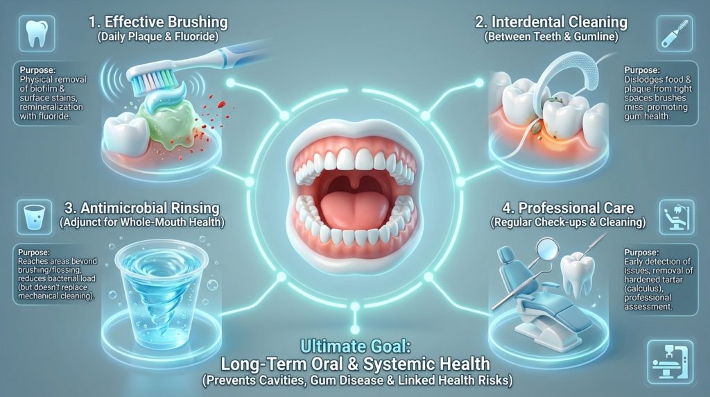 Oral hygiene refers to the daily habits and practices that keep the mouth, teeth and gums clean and help prevent dental disease. Common components of oral hygiene include brushing twice a day with fluoride toothpaste, cleaning between the teeth with dental floss or interdental brushes, gently cleaning the tongue, moderating sugary foods and drinks, and attending regular professional dental check-ups and cleanings.