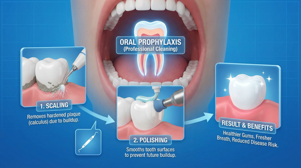 Oral prophylaxis is a routine professional dental cleaning performed by a dentist or dental hygienist to remove plaque, calculus (tartar) and surface stains from the teeth. The procedure commonly includes scaling with manual or ultrasonic instruments, polishing to smooth the enamel, and often flossing or application of topical fluoride; its purpose is to reduce bacterial buildup and support healthy gums and teeth.