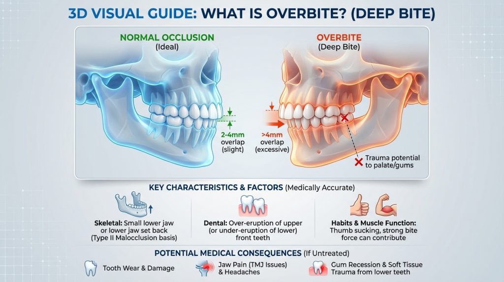 An overbite is the vertical overlap of the upper front (incisor) teeth over the lower front teeth. A small amount of overlap is normal, but a pronounced or ‘deep’ overbite — where the upper teeth cover a large portion of the lower teeth or contact the lower gum — can arise from jaw growth patterns, tooth alignment, early tooth loss, or oral habits such as thumb sucking and prolonged pacifier use.