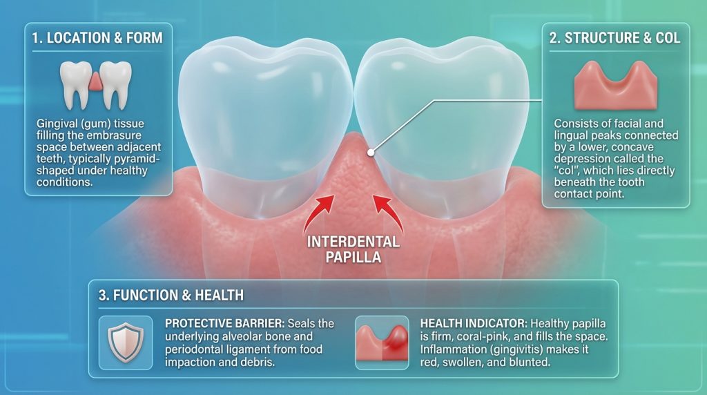 The interdental papilla is the small, triangular wedge of gum tissue that occupies the space between neighboring teeth. It helps seal the area against bacteria and food particles, supports the contact point between teeth, and contributes to gum contour and overall smile aesthetics.