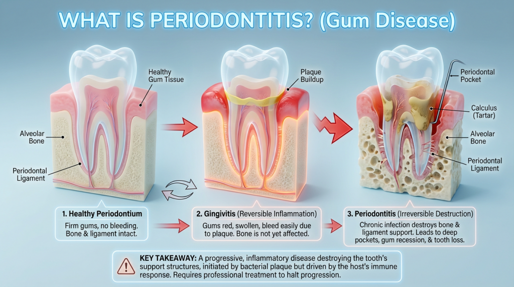 Periodontitis is an advanced form of gum disease that occurs when bacterial plaque and tartar build up around the teeth and under the gumline, causing inflammation that progresses deeper into the supporting structures. Common signs include swollen, bleeding, or receding gums, persistent bad breath, loose teeth, and formation of periodontal pockets where bacteria collect; the condition can lead to tooth loss and may be linked with systemic health issues if left untreated.