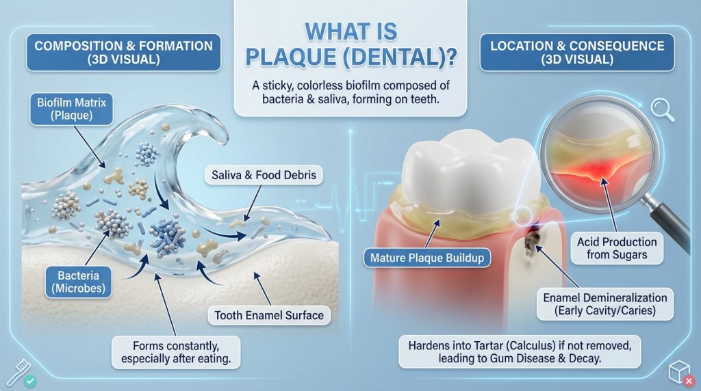 Plaque (Dental) is a soft, colourless or pale-yellow biofilm composed of bacteria, food debris and saliva that constantly forms on tooth surfaces and around the gumline. It develops when bacteria feed on sugars and fermentable carbohydrates from the diet, producing acids that can demineralise tooth enamel and irritate gum tissue.