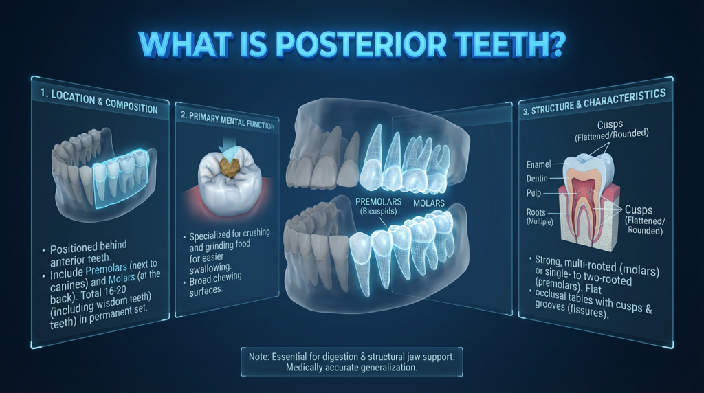 Posterior teeth are the premolars and molars located toward the back of the mouth. They have broader chewing surfaces with multiple cusps and often more complex root structures compared with front teeth, which makes them well suited for grinding and crushing food; wisdom teeth (third molars) are also classified as posterior teeth and may erupt later in life or cause crowding and other issues.