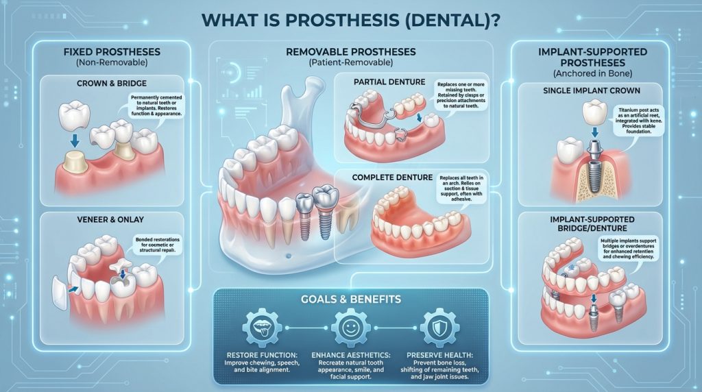 A dental prosthesis is a medical device made to replace one or more missing teeth and the surrounding supporting tissues. Common types include removable options such as complete or partial dentures and fixed solutions such as bridges or implant-supported prostheses; materials often used include acrylic, metal alloys and ceramics, and the main goals are to restore biting function, speech and facial appearance.