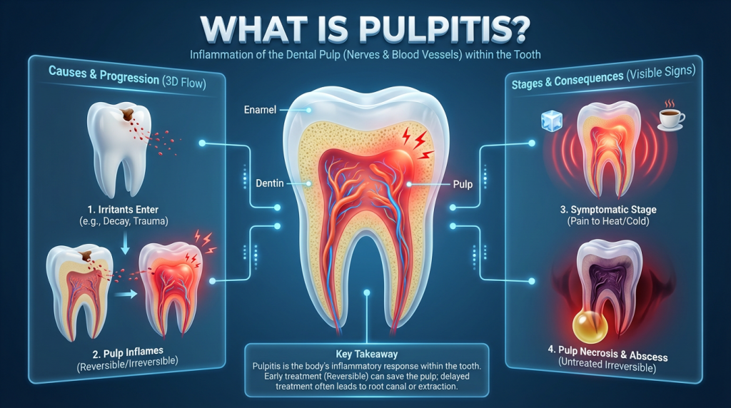 Pulpitis is the inflammation of the dental pulp, the soft tissue in the centre of a tooth that contains nerves and blood vessels. It most often results from deep tooth decay, dental trauma, repeated dental procedures on the same tooth, or a cracked tooth, and symptoms can include sharp or throbbing toothache, heightened sensitivity to hot or cold, and pain that may worsen when lying down or when pressure is applied to the tooth.