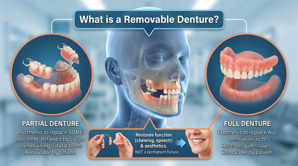 A removable denture is a dental prosthesis designed to replace some or all missing teeth and the adjacent gum tissue and can be taken out and reinserted by the wearer. Partial removable dentures attach to remaining natural teeth or rest on the gums to replace a few teeth, while complete (full) removable dentures replace an entire arch; common materials include acrylic resin, sometimes combined with metal frameworks to improve strength and fit.