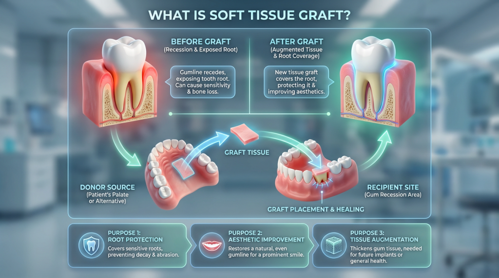 A soft tissue graft is a periodontal surgical procedure that transplants or augments gum tissue to cover exposed tooth roots or increase the thickness of thin gums. It is commonly used to treat gum recession, protect root surfaces from decay and sensitivity, and to improve the appearance and long-term stability of the gum margin around natural teeth or dental implants.