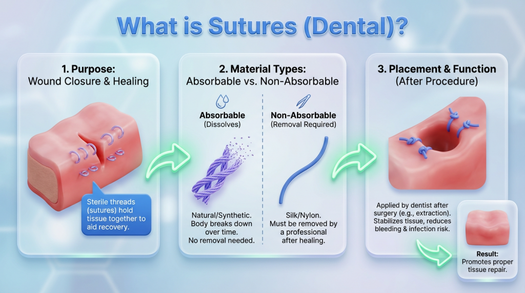 Sutures (dental) are threads used by dentists and oral surgeons to bring soft tissues together after procedures such as tooth extraction, implant placement, periodontal surgery or bone grafting. They stabilise wound edges, help control bleeding and promote predictable healing; sutures are available as absorbable materials that dissolve over time or as non-absorbable materials that require removal, and the choice depends on the procedure, tissue type and clinical goals.