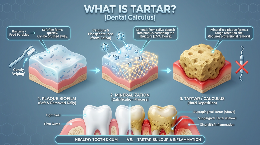 Tartar is a hard, calcified deposit that forms when dental plaque mineralises on the surfaces of teeth and around the gumline. It is composed of bacteria, food particles and minerals from saliva, typically appearing as a yellowish or brownish layer; once tartar has formed it cannot be removed by regular brushing or flossing alone.