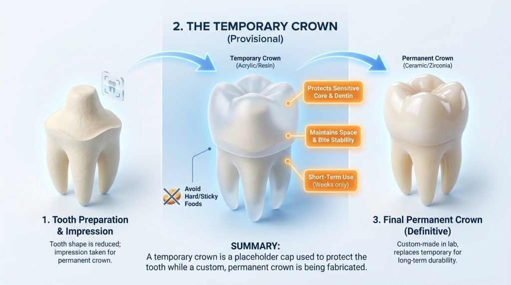A temporary crown is a removable, short-term cap that fits over a prepared tooth to protect it while a permanent crown is fabricated. Typically made from acrylic or composite resin and attached with temporary cement, a temporary crown protects exposed dentine, maintains the correct tooth position in the arch, preserves chewing function and helps with appearance during the interim period, usually lasting from a few days to several weeks.
