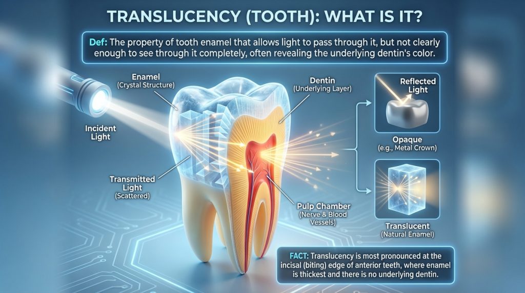 Translucency (Tooth) refers to the way light passes through a tooth’s enamel and dentine, producing depth, sheen and subtle colour variations that affect how a tooth looks. The degree of translucency is influenced by enamel thickness, mineral composition, age and intrinsic staining, and it differs between people and between different teeth.