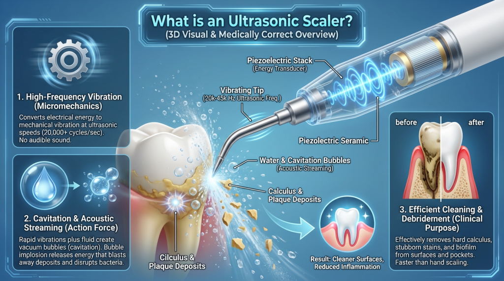 An ultrasonic scaler is a powered dental instrument that uses high-frequency vibrations to dislodge and remove plaque, calculus (tartar) and bacterial biofilm from teeth and along the gumline. The oscillating metal tip works together with a controlled water spray to flush away loosened deposits and cool the tip, making it effective for routine professional cleanings, stain removal and periodontal therapy.