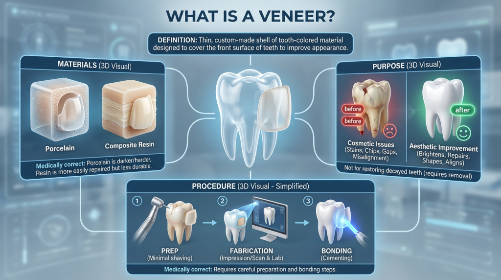 A veneer is a thin, custom-made shell—commonly made from porcelain or composite resin—designed to cover the front surface of a tooth. Veneers are used to correct discolouration, chips, minor misalignment, gaps and worn enamel; porcelain veneers are usually fabricated in a laboratory and require a small amount of enamel removal for a natural appearance, while composite veneers can often be applied directly to the tooth in a single visit.