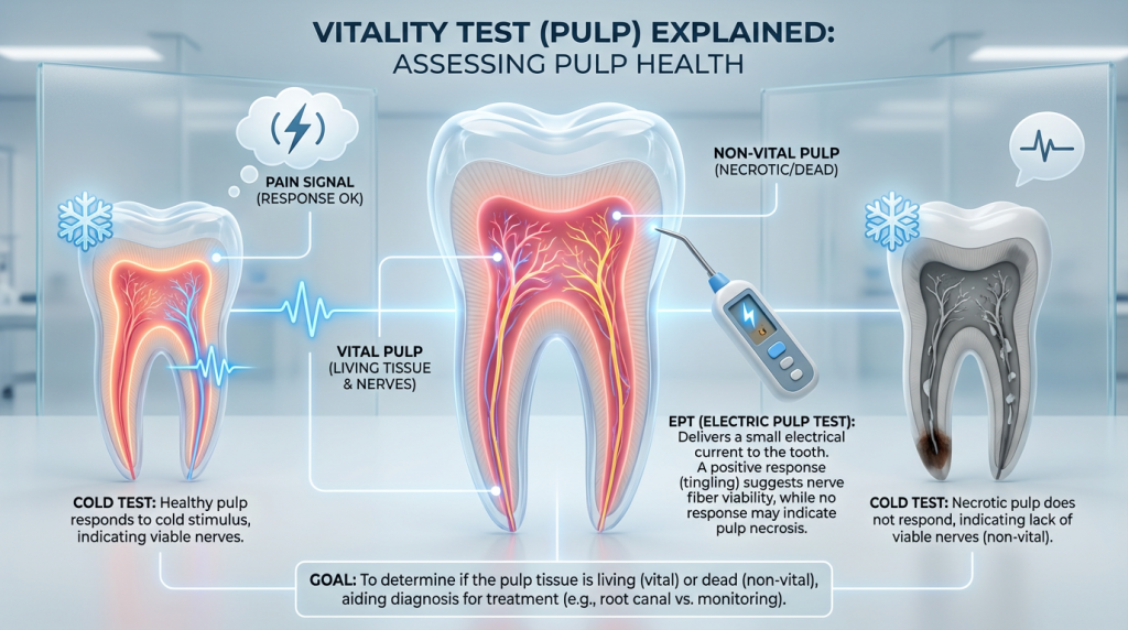 A vitality test (pulp) is a dental assessment used to determine the health of the soft tissue (pulp) inside a tooth, which contains nerves and blood vessels. The test typically involves applying a controlled stimulus—such as a cold or warm sensation or a small electrical impulse—along with clinical examination and radiographs to evaluate whether the pulp is responding normally, inflamed, or non-vital.